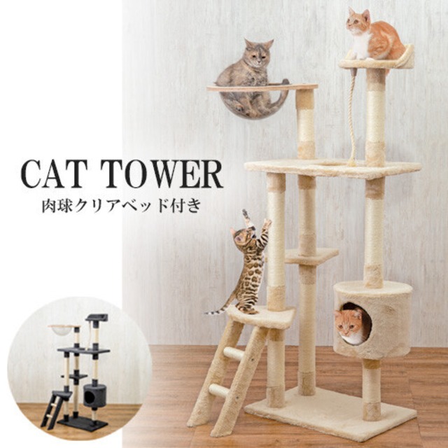 ネコちゃんの運動不足解消はもちろん、タワーで爪とぎすることで家具や壁での爪とぎの回数を減らしたり、高い場所に寝床を確保することで安心して休めます。 室内にちょうど良い省スペース型の据え置きタイプです。 じゃれて遊べるロープや肉球見放題のクリアベッド付き。 表面は起毛張りで暖か。 全ての支柱(ポール)には麻ひもが巻かれており、思う存分爪とぎが可能です。 ※室内専用、水ぬれ厳禁 ▼サイズ 全体:幅60〜87×奥行68〜80×高さ150cm 重さ:14.2kg 耐荷重量(全体):10kg ▼素材 MDF・麻ひも・布張り、透明ボウル:PET・積層合板 ※お客様組立式 ▼生産地 中国 ▼お届け日 15日~20日程度 ※掲載画像は、ご利用の端末やモニターの環境、撮影状況などの違いにより、実際の色合いと多少異なる場合がございますのであらかじめご了承ください。 ※イメージの違い、仕様変更による返品、交換はできませんので予めご了承ください。 ※受注発注商品のため、「在庫あり」と表示されていても、発注のタイミングによって欠品している場合がございます。できる限り在庫管理を努めて参りますが、欠品の場合はご注文をキャンセルさせていただきますことをご了承下さいませ。