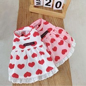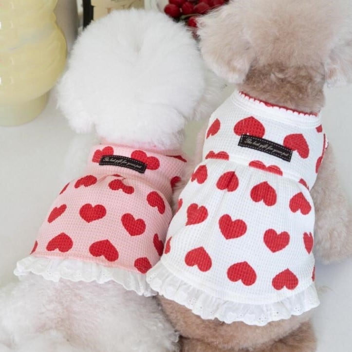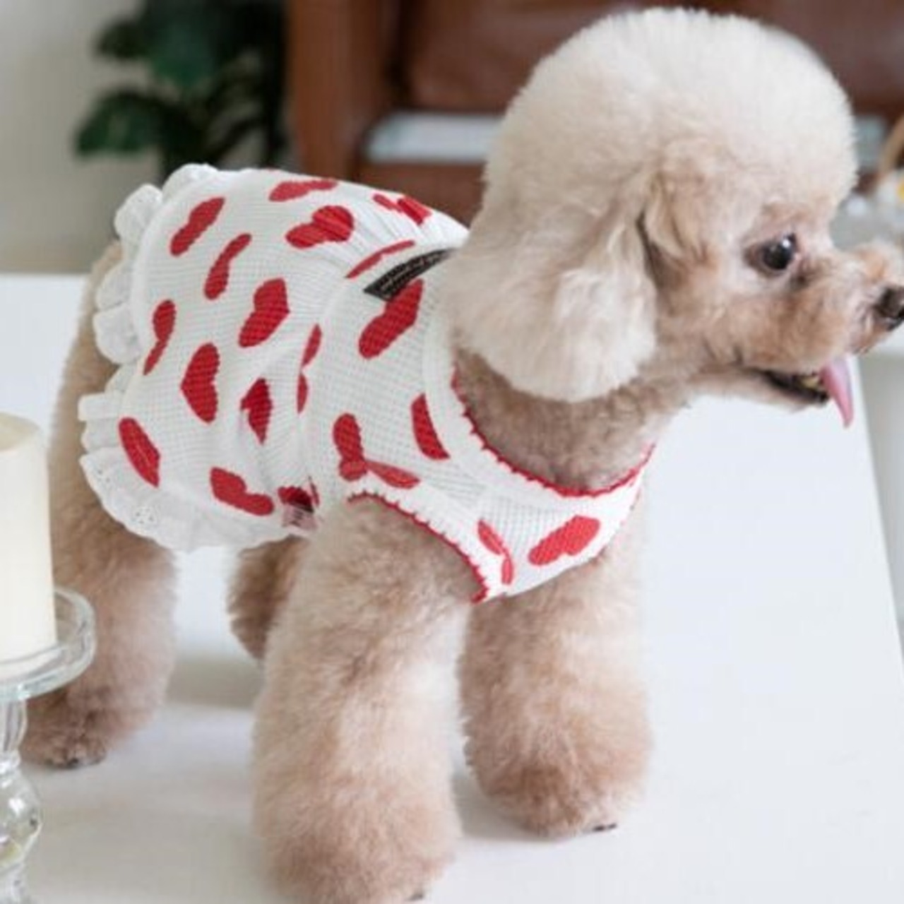かわいらしいハート柄とフリルレースが目を引くペット服。フリルレースがアクセントになり、おしゃれなペットちゃんに華やかさをプラスしてくれます。柔らかなワッフル素材で、着心地も抜群。可愛いだけでなく、実用性も兼ね備えています。お出かけやお写真撮影にも最適な一枚です。