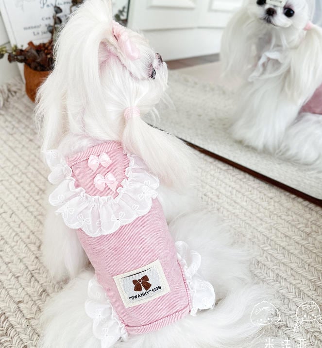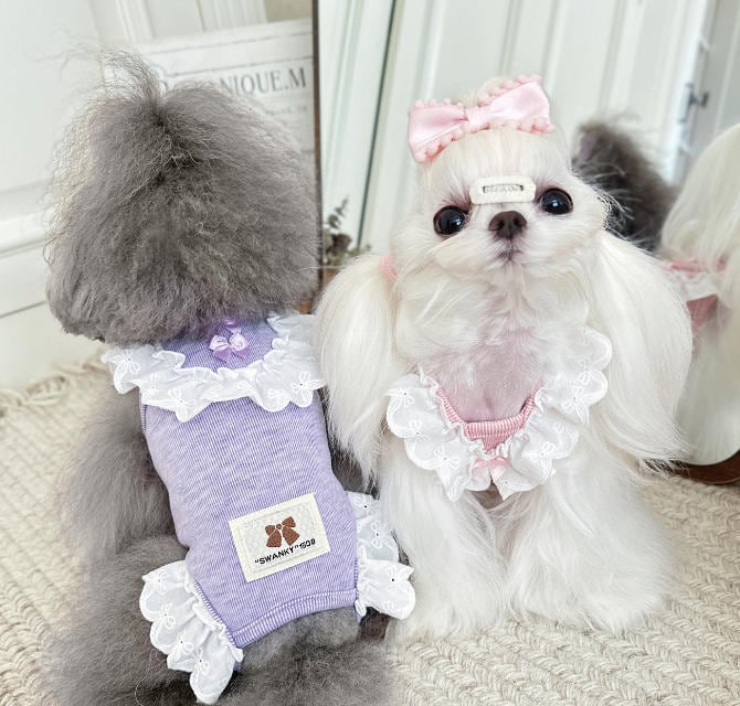 《ラグジュアリーなデザイン!オールインワン犬服!》この犬服は、華やかなレースフリルデザインが特徴で、愛犬を一層可愛く演出します。オールインワンタイプで、術後着としてもご利用いただけるため、機能性も備えています。
