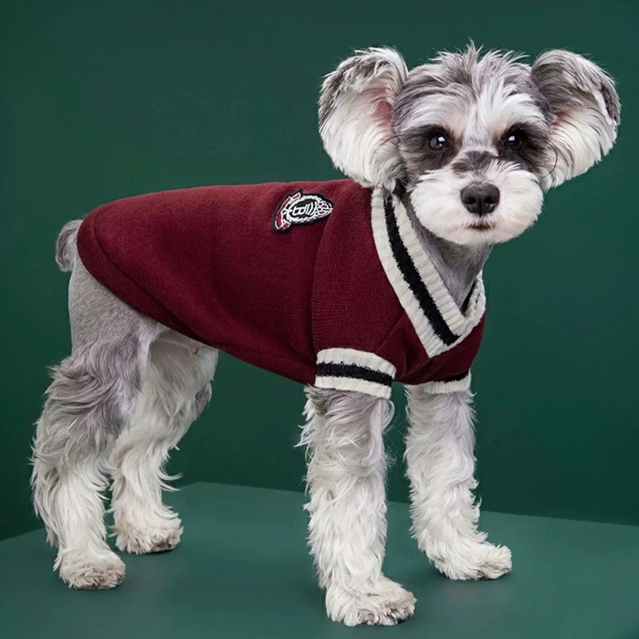 オシャレでかわいい校章のようなワンポイントが目を引くデザインのニットセーターです。スクールユニフォームをイメージしたトラディショナルなスタイルは、秋冬のお散歩やお出かけにぴったり。おしゃれでかわいいだけでなく、暖かくて快適です。