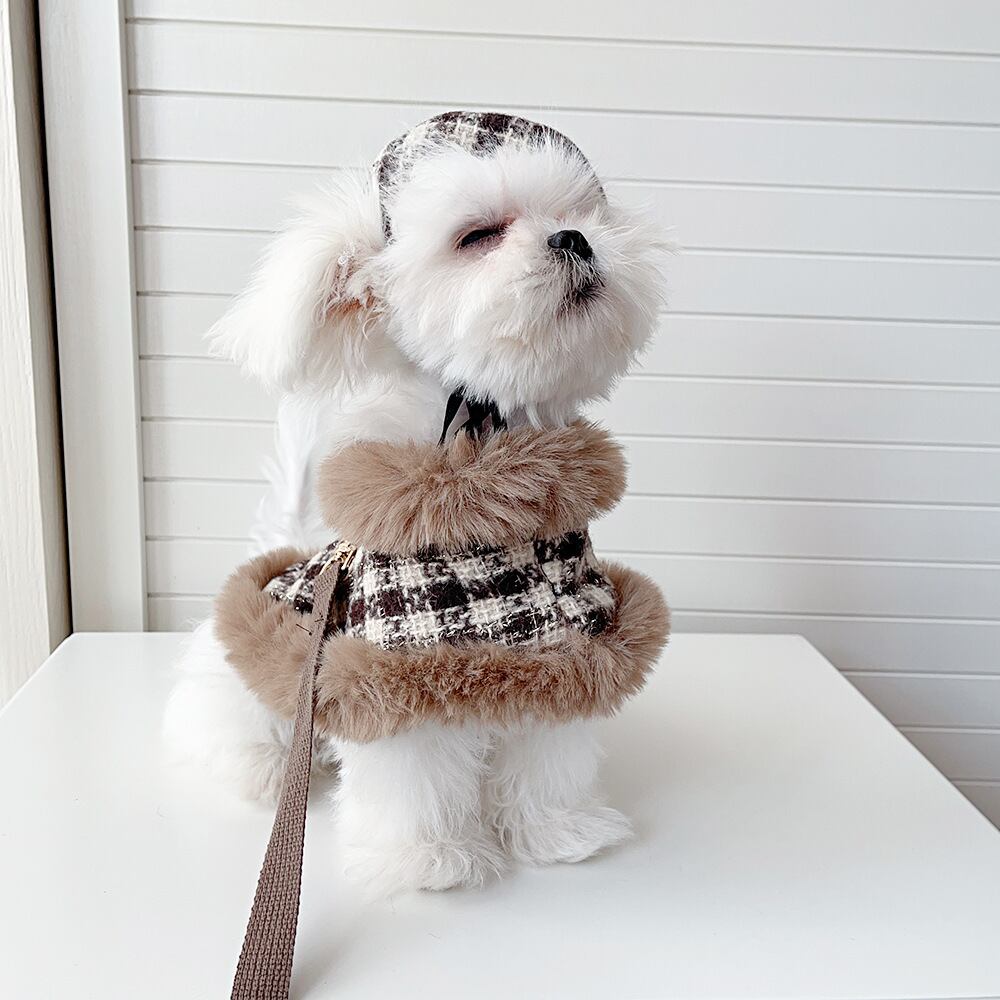 可愛らしいチェック柄のファーマントとベレー帽、さらにリードがセットになった3点セットです。もこもこファーが温かさをキープし、愛犬のおしゃれを一層引き立てます。特別なお出かけや日常のお散歩にピッタリなアイテムです!