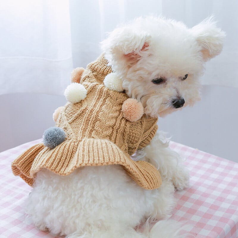 寒い冬にぴったりなボンボン付きのニットワンピースが登場しました!おしゃれでかわいいデザインは、小型犬から大型犬まで幅広いサイズに対応。暖かいニット素材が愛犬を包み込み、寒さから守ります。