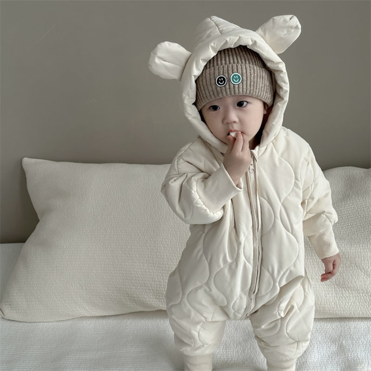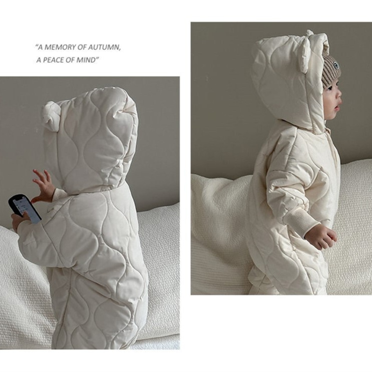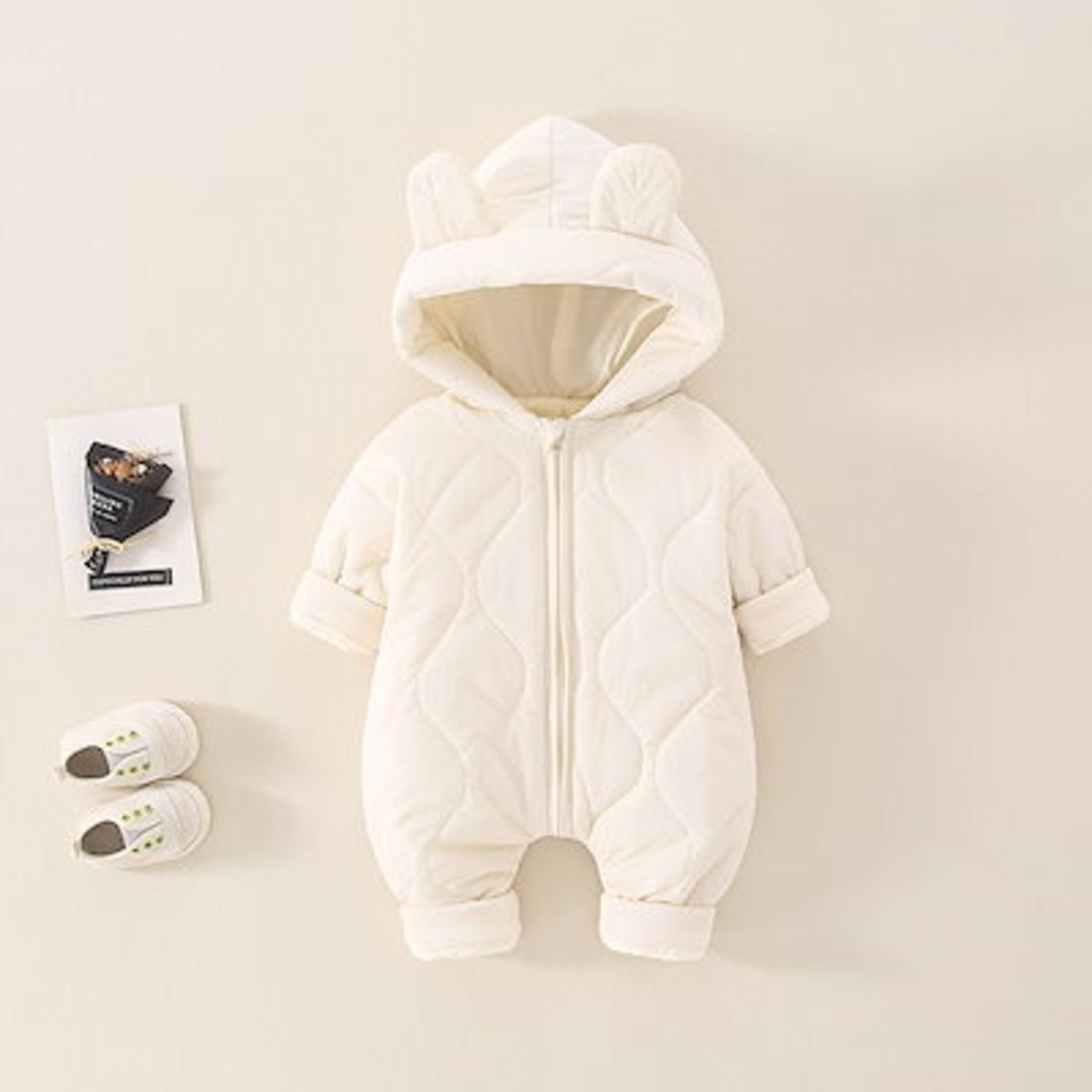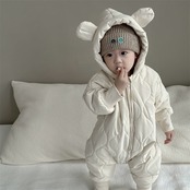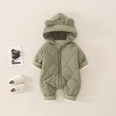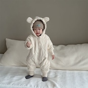 もふもふの裏起毛キルティング素材が魅力的なロンパースです!秋冬の寒い季節も、赤ちゃんをしっかりと暖かく包み込みます。耳付きの可愛らしいフードが特徴で、お子様の気分を明るくしてくれることでしょう。お友達へのギフトや出産祝いにも最適な一着です。