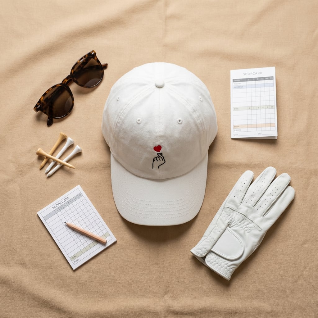 おしゃれで機能的なゴルフキャップが登場です!オリジナルのロゴマーク”キュンハート”が刺繍されたこの帽子は、ゴルフやテニスを楽しむ際にぴったりのアイテムです。シンプルでありながらもスタイリッシュなデザインは、スポーツだけでなく普段使いにも最適です。