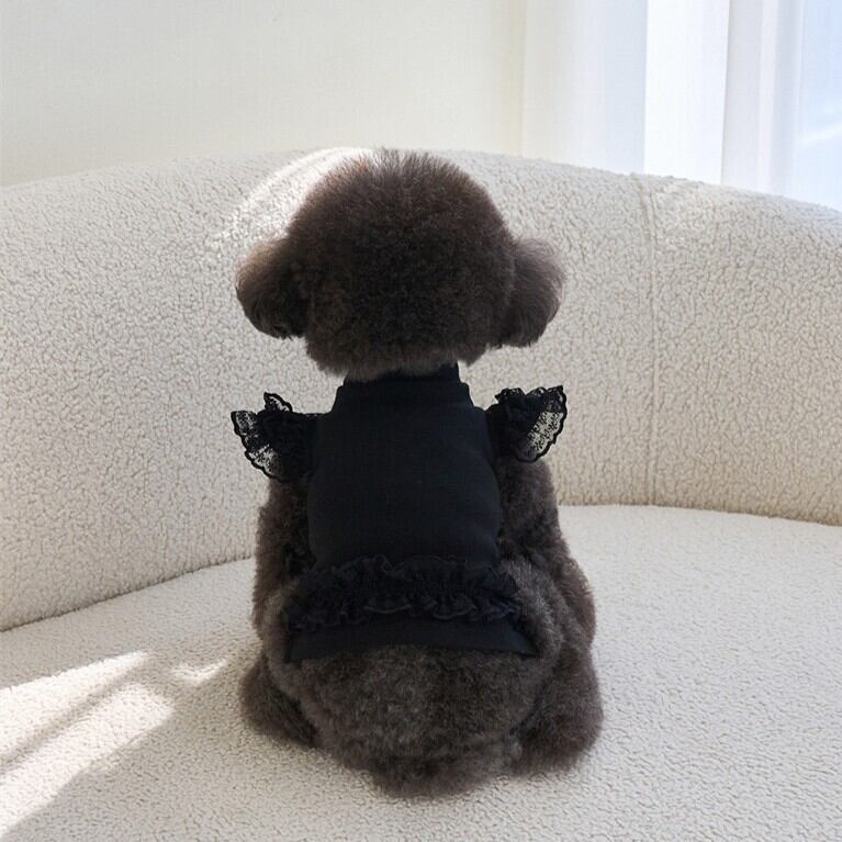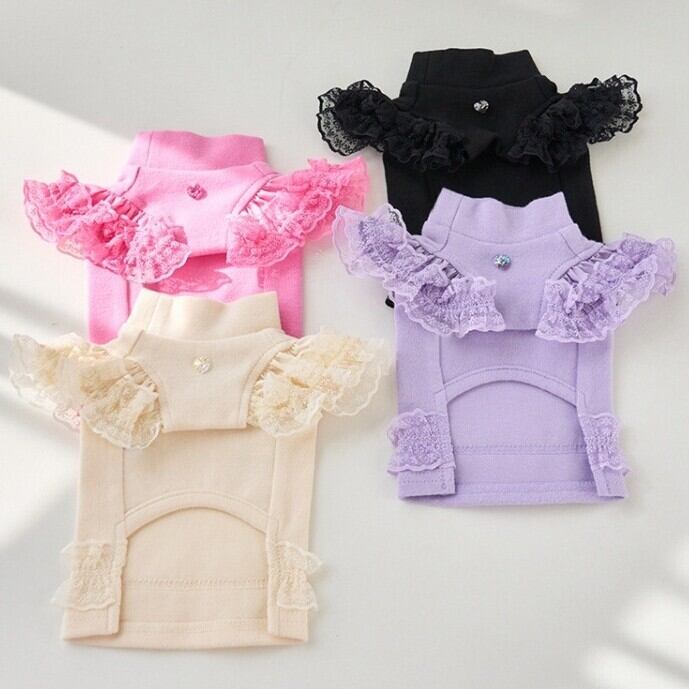 レースデザインの袖がアクセントのフリースニットトプスが登場しました!寒い季節のお散歩やお出かけにぴったりの温かさと、おしゃれなデザインが魅力です。小型犬から大型犬まで幅広く対応できるサイズ展開で、どんな愛犬にもフィットします。