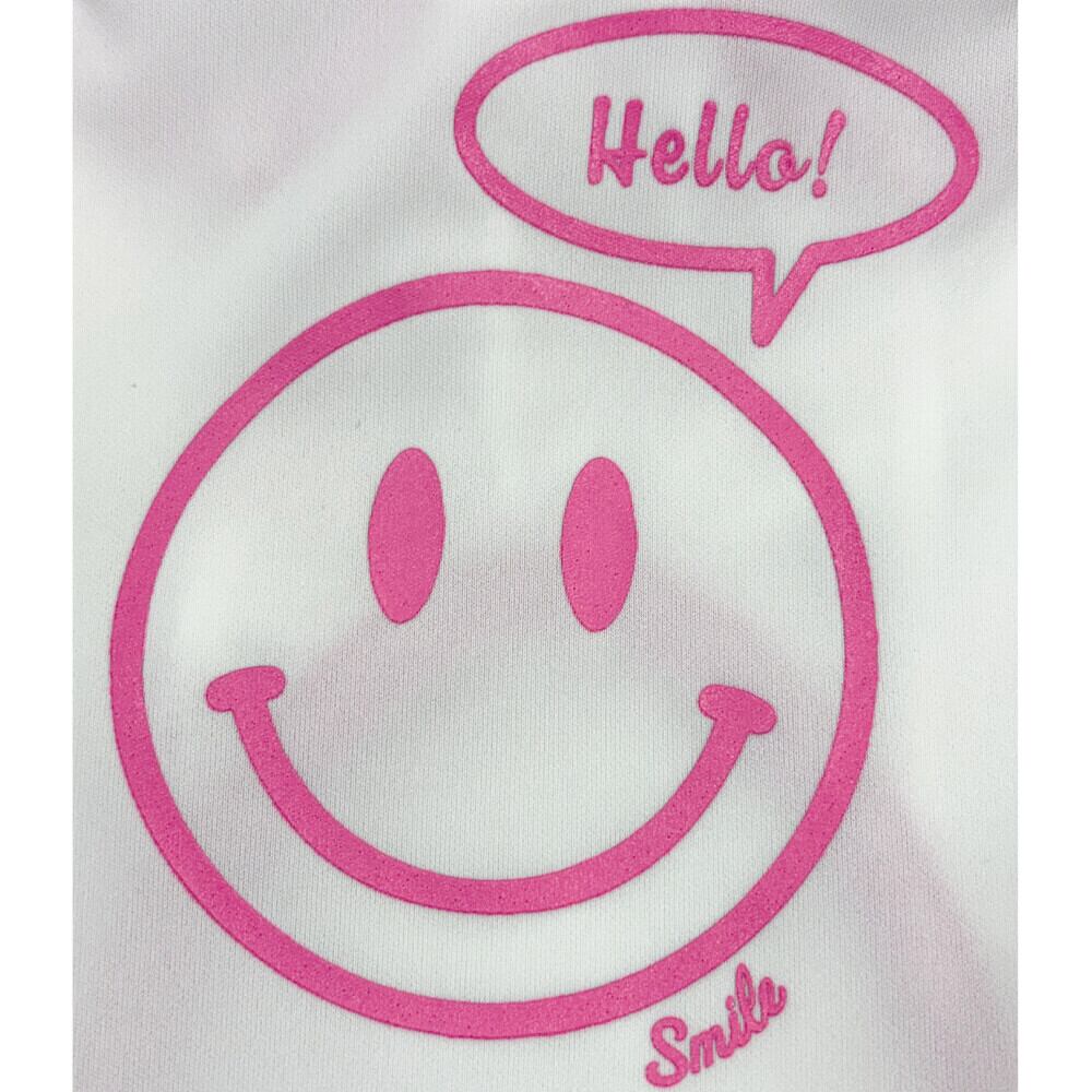 大きなニコちゃんの4色プリント。前身頃のキラキラワッペンとリボンもCUTE♪
