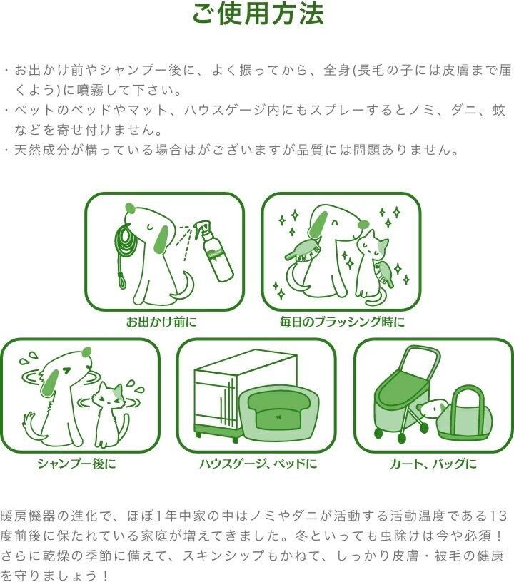 ・ペットの全身にまんべんなくスプレーし、皮膚・被毛にしっかりなじませて下さい。
