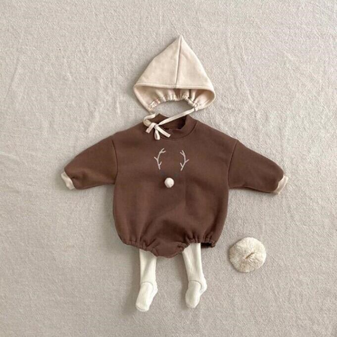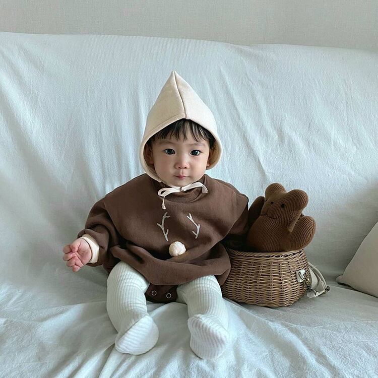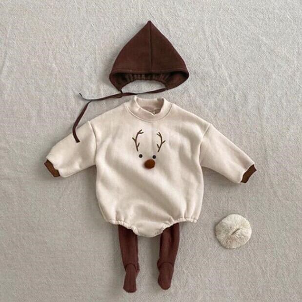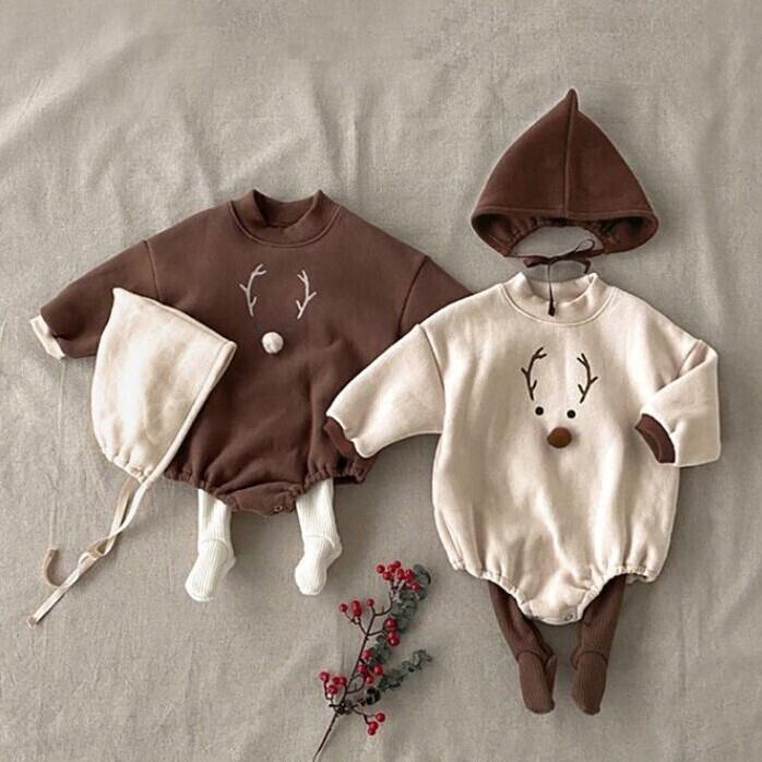 クリスマスにぴったりのデザインで、落ち着いたカラーが特徴的です。トナカイの顔が描かれたスウェットロンパースと、三角帽子の組み合わせは、秋冬のファッションを一層楽しむことができます。ビッグサイズでゆったり着られるので、赤ちゃんやキッズの動きも軽やかです!